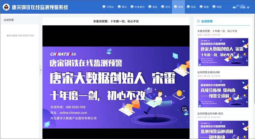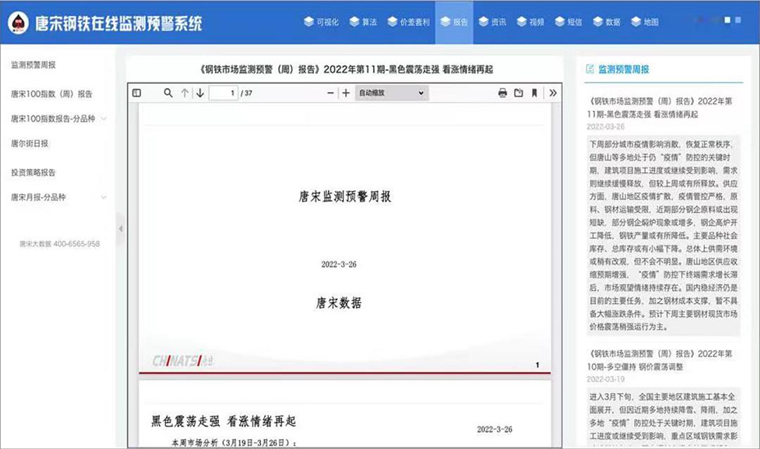 唐宋钢铁在线监测预警平台是唐宋集团依托自有研发团队打造的国内一流行业智能决策平台,在唐宋数据库、信息平台和唐宋钢铁经济研究院一系列研究成果的基础上,建立行业专家定期审定制度,利用一系列经济指标、技术指标建立起来的市场和行业的“晴雨表”和“报警器”。