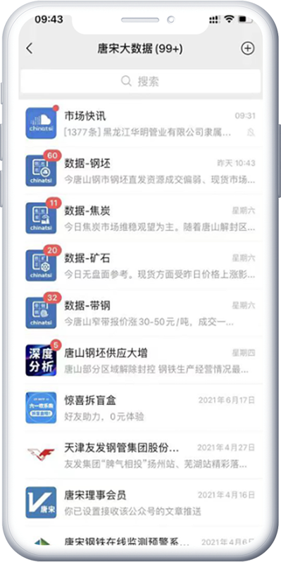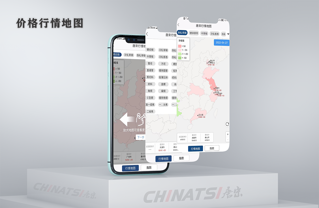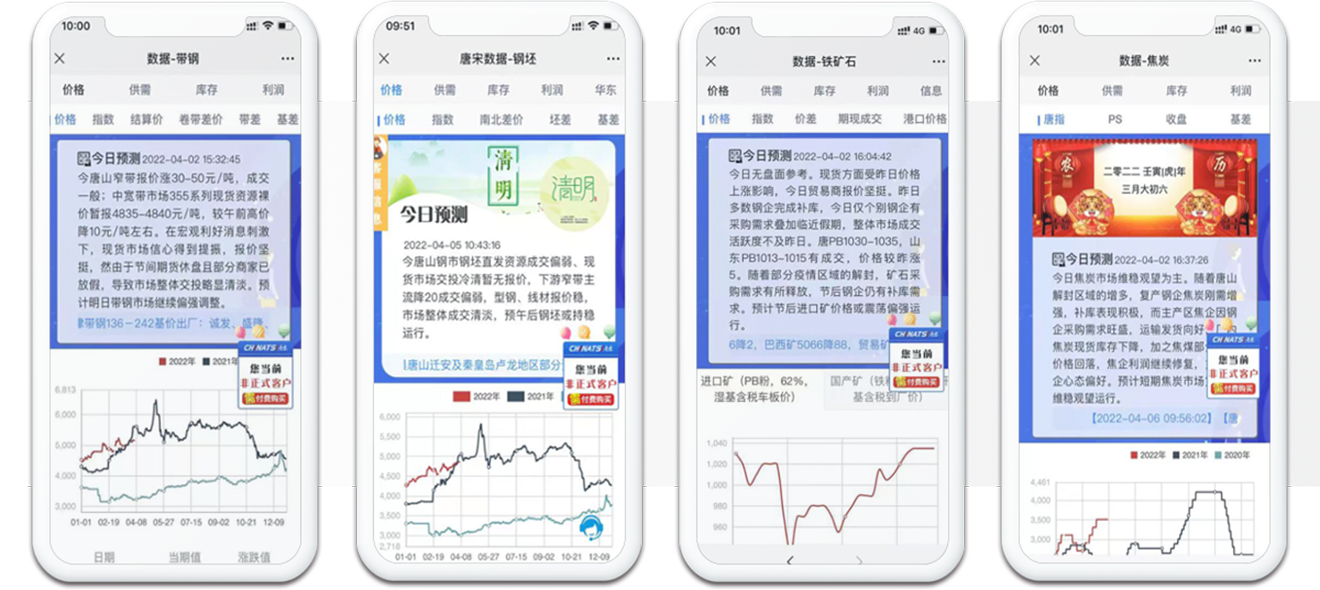 手机终端,核心数据,一键成图,钢坯数据,带钢数据,焦炭数据,铁矿石数据;唐宋信息产品重要的推送手段之一,具有随身、及时、方便等特点。